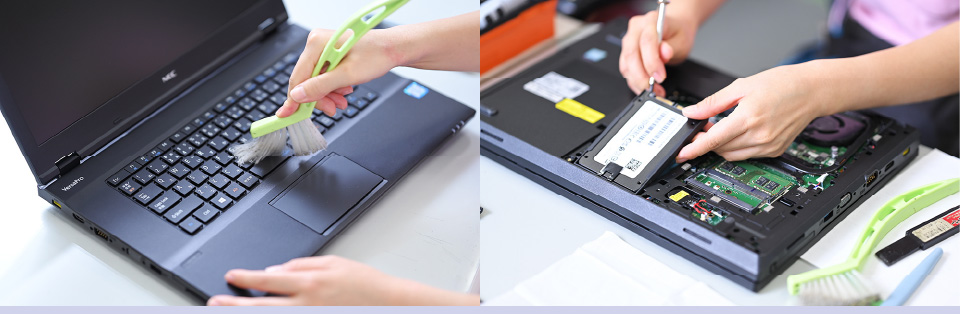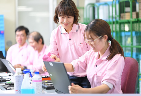 かんでんエルハートの事業 SERVICE PCリファービッシュ 企業等でリース期間が終了、あるいは廃棄予定の中古パソコンを集め、OSのインストールやパーツ交換、外装クリーニングを施し、再製品化して発送するまでの業務を行っています。 取り扱いに注意しながら、ひとつひとつ丁寧に作業していきます クリーニングや部品交換などの作業を分担しあいます 助け合いながらチーム作業を行います